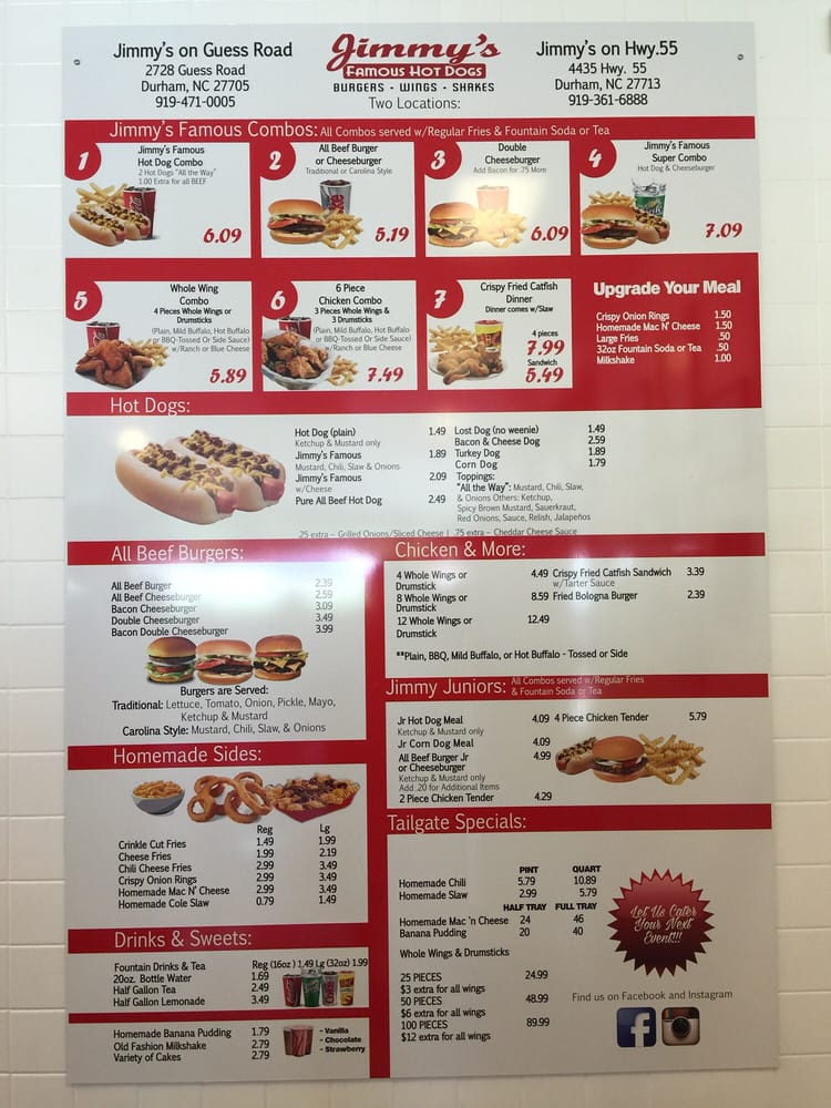 Looking for a taste of classic American hot dogs and burgers? Jimmy's Famous Hot Dogs in Durham, NC is the place to go. With a variety of options ranging from hot dogs to burgers, this restaurant offers something for everyone. The menu includes favorites like chili dogs, burgers, and even banana pudding for dessert. Customers rave about the quality of the food, with reviews mentioning the incredible hot dogs and catfish sandwiches. While some customers note the simplicity of the menu, others appreciate the straightforward, no-frills approach to classic comfort food. Overall, Jimmy's Famous Hot Dogs is a hidden gem in Durham, offering delicious food in a welcoming environment. If you're in the area, don't miss out on a visit to this hotspot.
